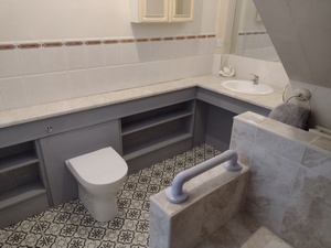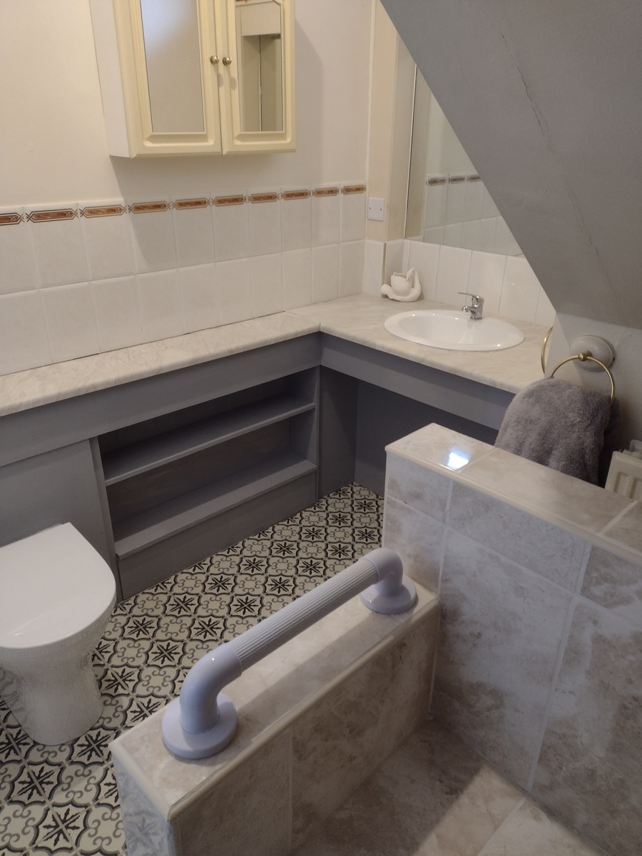The bathroom has a concealed white toilet, white vanity unit and shower with a built in tiled seat and plenty of hand rails.