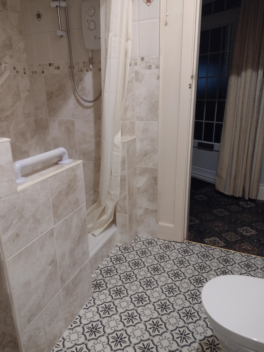 * Shower enclosure fully tiled with built in seat, with an electric shower,