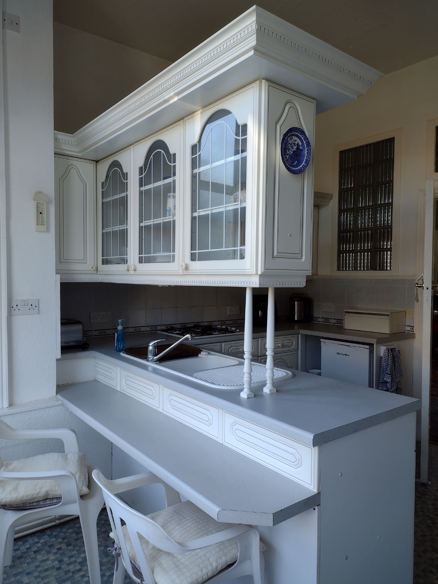 The low level breakfast bar can accomodate three people but two have plenty of room to spread out.
