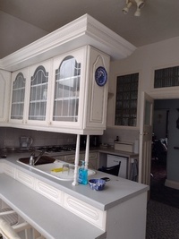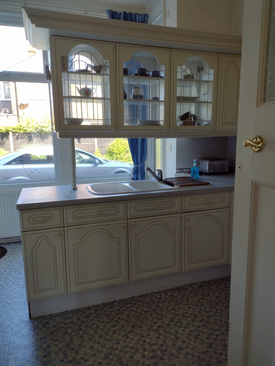 The kitchen base and wall cabinets are white with a grey line, they are not new but all still in good working order.
